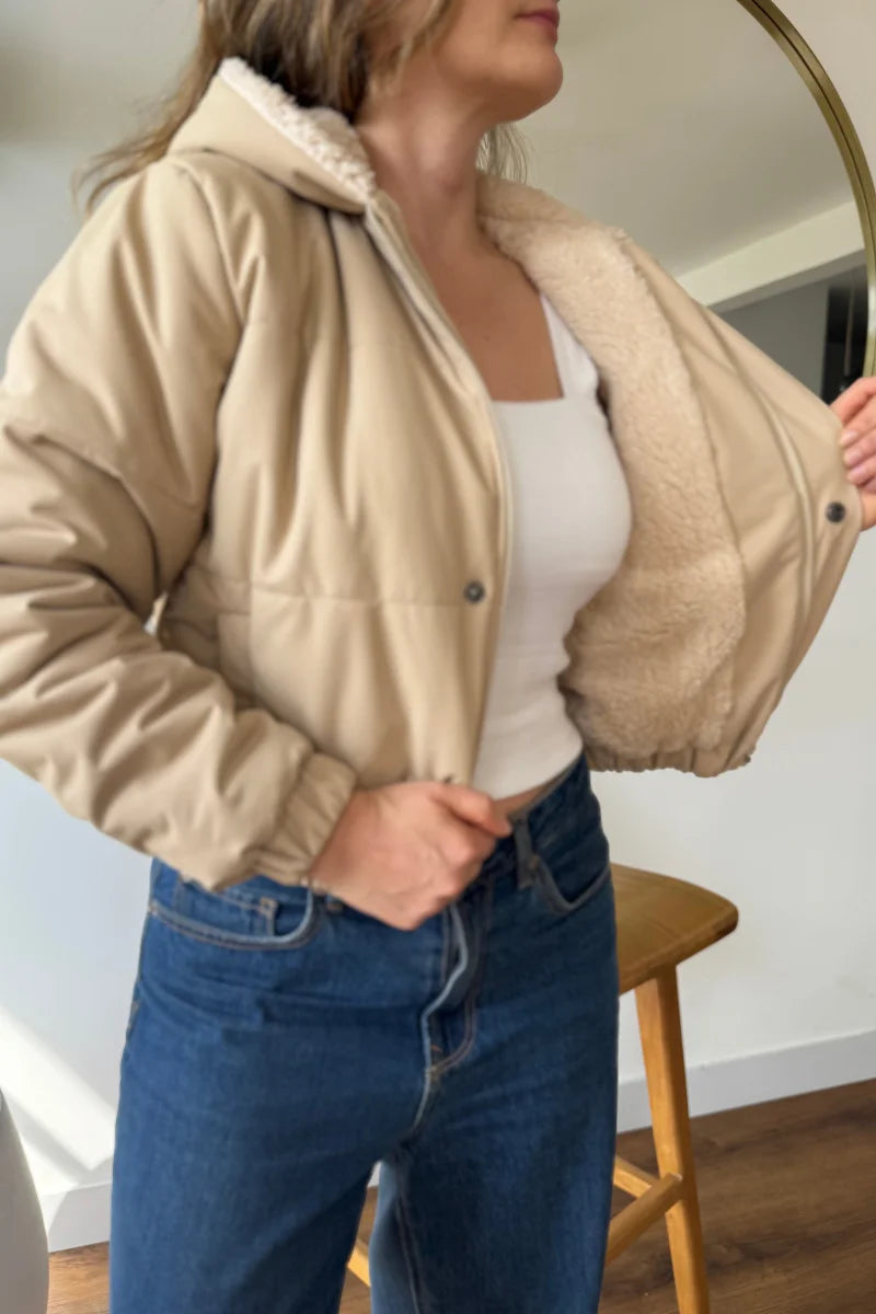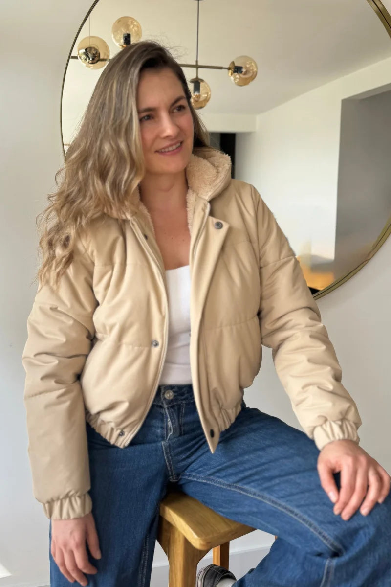 Su diseño moderno y ajuste en la cintura realzan la silueta, mientras que los detalles interiores aportan un toque sofisticado y cálido. Perfecta para complementar cualquier outfit casual o urbano.