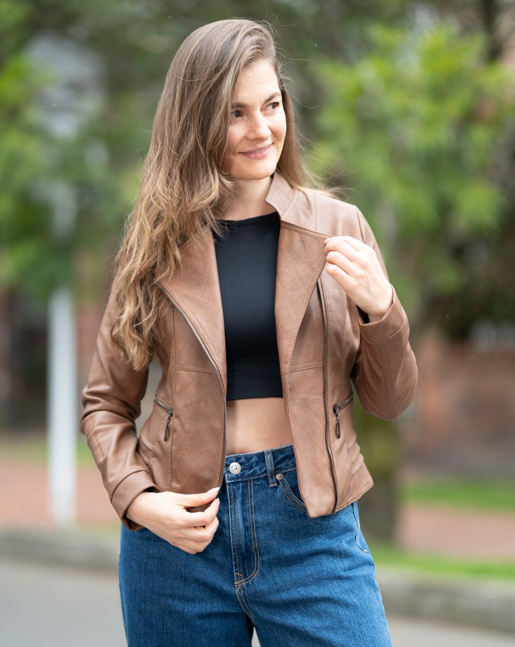 Las chaquetas efecto cuero son ideal para armar un outfit casual o elegante. Tiene cortes asimétricos que permitirá se ajuste Perfecto a tu figura, el forro interno es liso con Spandex permitiendo que la prenda sea bastante cómoda.